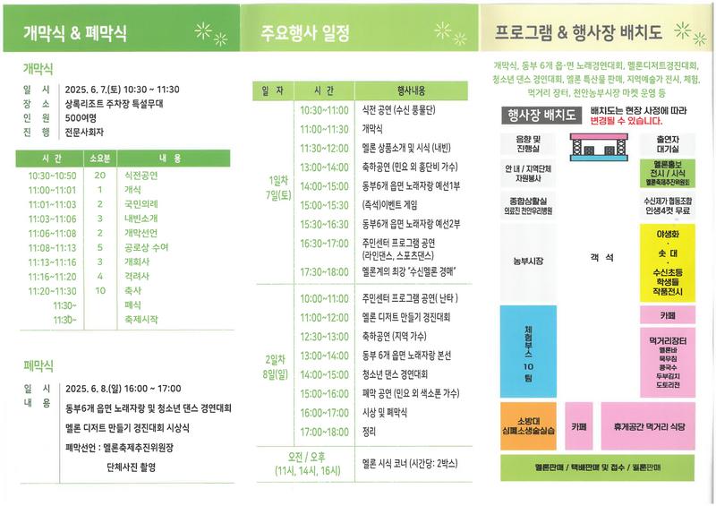 축제는 7일 오전 11시 개막식을 시작으로 ▲주민자치센터 우수프로그램 공연 ▲동부 6개면 노래자랑 ▲멜론경매 ▲청소년 댄스경연대회 ▲수신멜론 디저트 만들기 대회 등 세대를 아우르는 다채로운 체험과 볼거리가 이어진다.