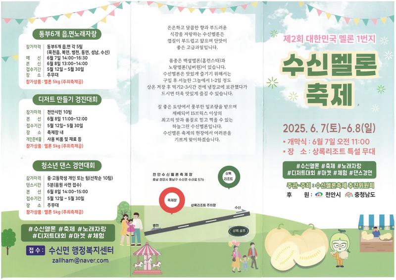 천안시 수신면(면장 최권용)은 오는 7~ 8일 천안상록리조트 주차장 내 특설무대에서 제2회 수신멜론축제를 연다.