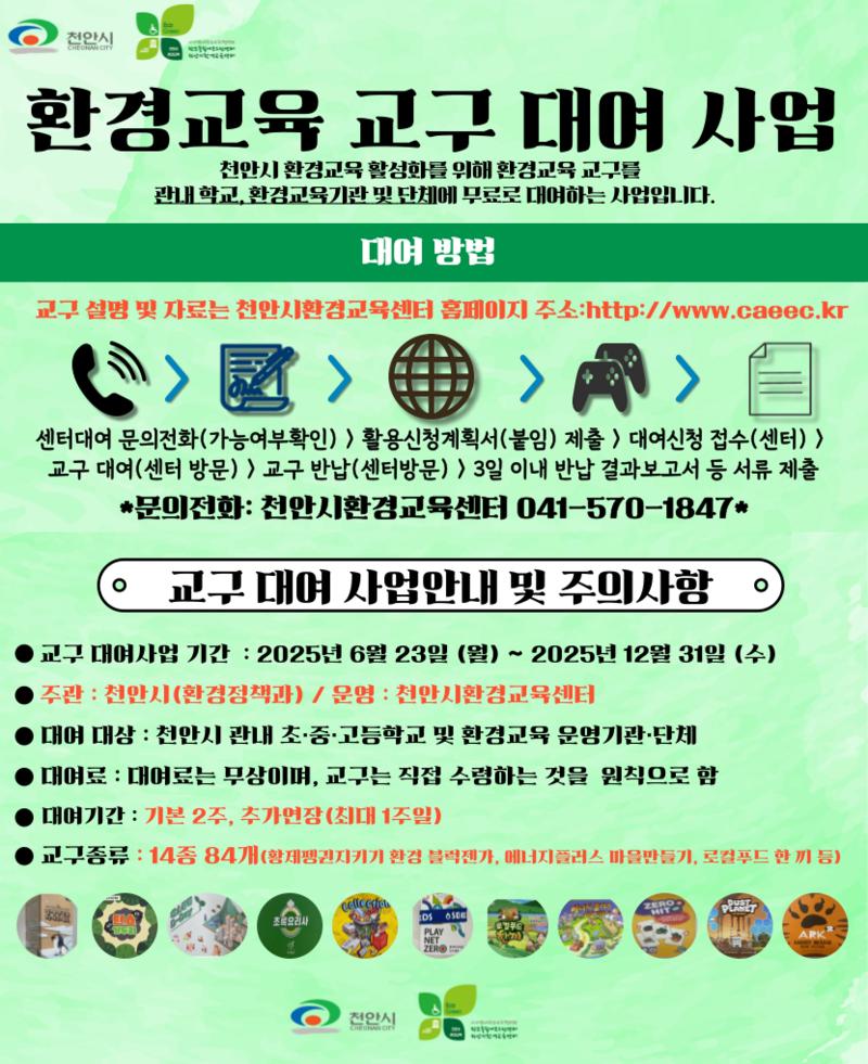 교구 대여 신청은 천안시환경교육센터와 사전 협의를 통해 가능하며, 신청 후 직접 센터를 방문하여 수령하는 방식으로 운영된다.