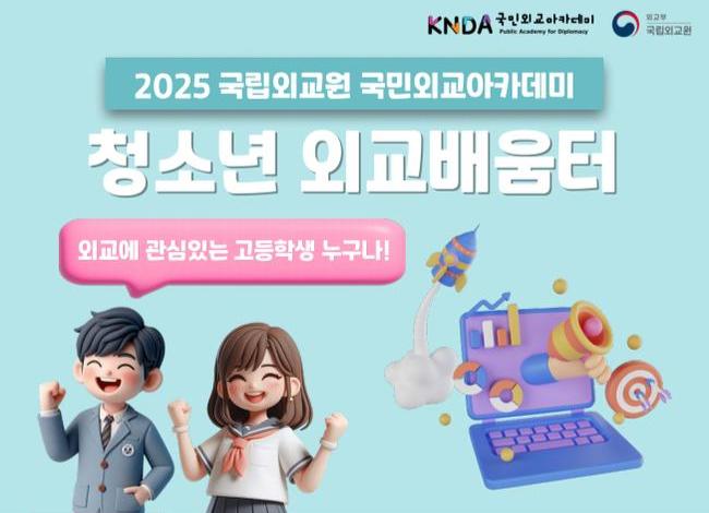 국립외교원이 외교와 국제관계에 관심 있는 고등학생을 대상으로 2025년 국민외교아카데미 「청소년 외교배움터 과정」 참가자를 모집한다고 23일 밝혔다.