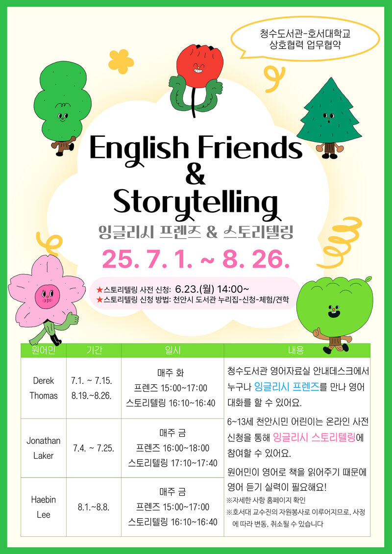 천안시 청수도서관(관장 문현주)은 여름방학을 맞이해 오는 7~ 8월 호서대 더:함교양대학 원어민 교수진과 함께하는 영어 프로그램을 운영한다고 23일 밝혔다.