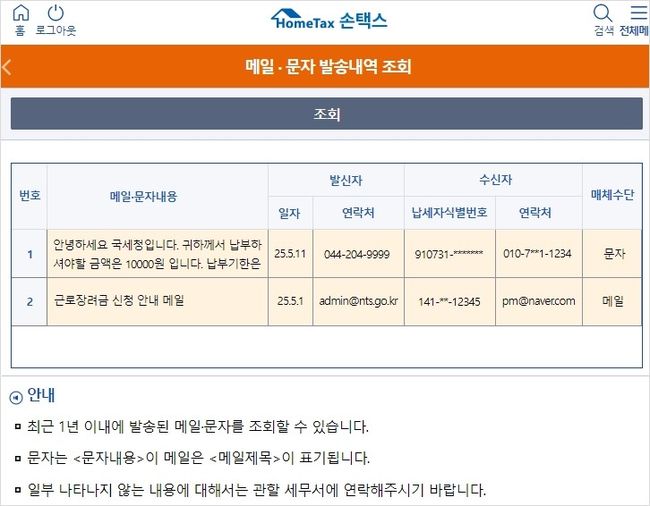 모바일 홈택스(손택스) 제공 화면 [모바일 홈택스] → [My홈택스] → [메일・문자발송내역조회]
