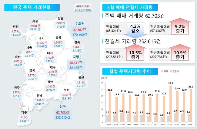 5월 주택시장, 수도권 중심 회복세…분양 증가·미분양 감소에도 착공은 주춤 - 수도권 인허가·분양 실적 개선…서울 분양 294%↑, 준공 51%↑ - 비수도권은 전반적 감소세…분양 85%↓, 착공·준공도 동반 감소 - 미분양 물량 1.6% 줄어…준공 후 미분양은 증가세 이어져
