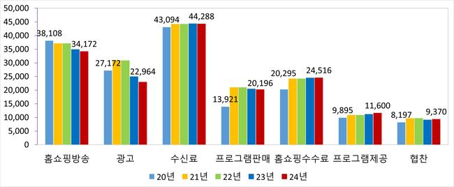 유료방송사업자의 기본채널수신료 매출은 IPTV를 중심으로 2.2% 증가한 3조 1,356억 원을 기록했으며, TV홈쇼핑 매출은 3.2% 감소, 데이터홈쇼핑은 1.3% 증가한 것으로 나타났다. 홈쇼핑PP 전체 매출은 3조 4,170억 원으로 전년 대비 763억 원(2.2%) 줄었다.