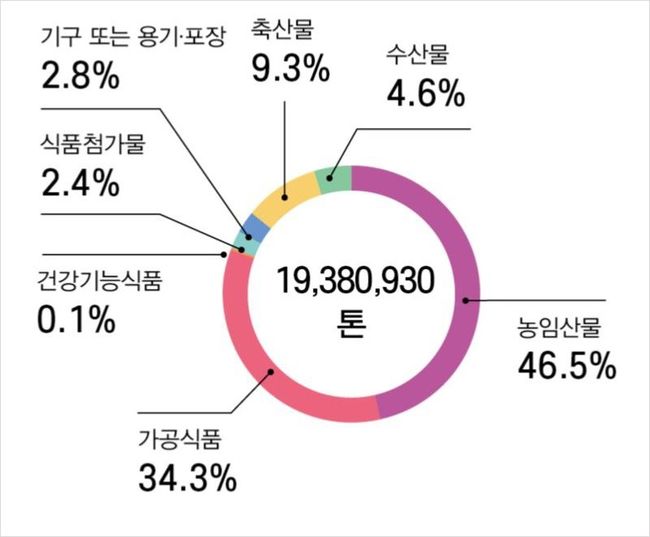 2024년 우리나라로 수입된 식품이 1,938만 톤, 357억 달러에 달하며 전년 대비 수입량은 5.4%, 금액은 2.7% 증가한 것으로 나타났다. 수입 건수도 전년보다 6.8% 늘어난 84만 6천여 건으로 집계됐다.