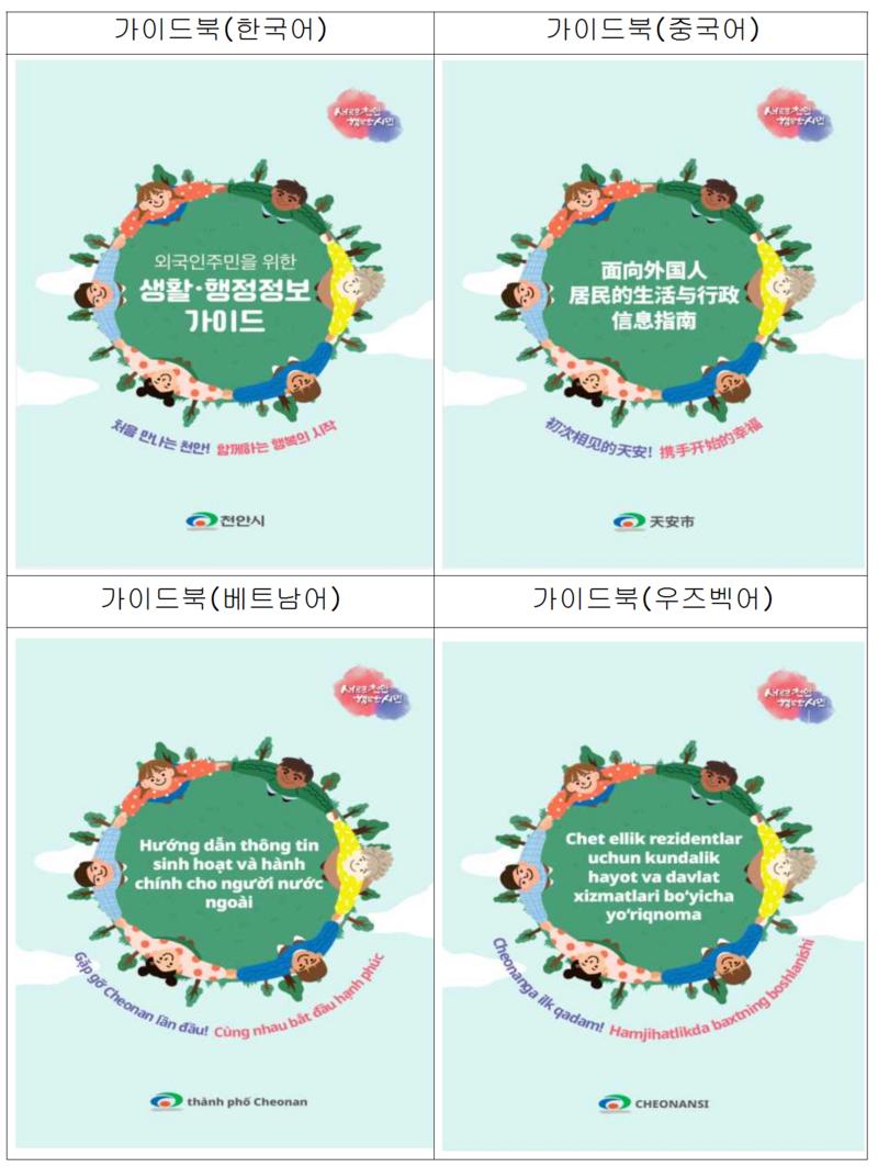가이드북에는 ▲천안시 소개 ▲외국인주민 및 다문화가족 지원사업 ▲생활폐기물 배출 방법, 취득세 등 생활정보 ▲외국인주민 의료지원 ▲외국인등록 및 체류 ▲관련 기관 안내 등이 담겼다.