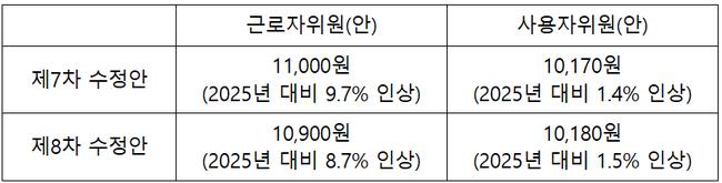 근로자 측은 제7차 수정안으로 시급 11,000원(2025년 대비 9.7% 인상), 제8차 수정안으로는 10,900원(8.7% 인상)을 제시했다. 이에 맞서 사용자 측은 각각 10,170원(1.4% 인상), 10,180원(1.5% 인상)을 제안했다.