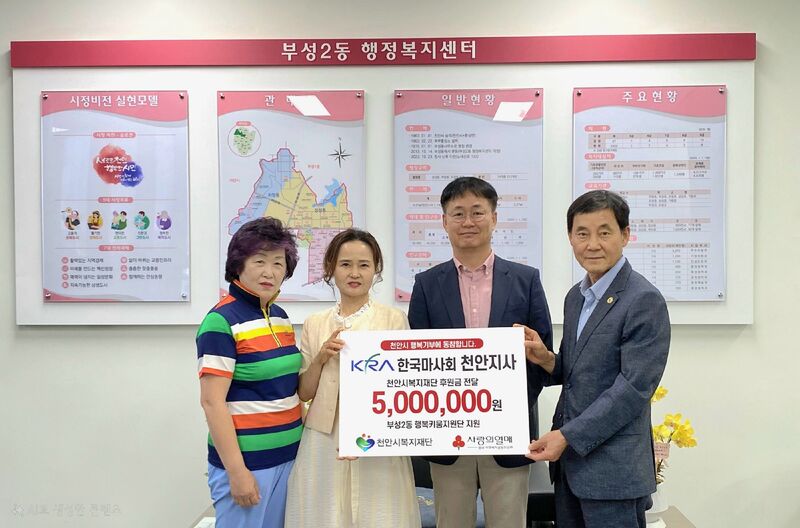 천안시 부성2동(동장 장현숙)은 10일 한국마사회 천안지사(지사장 정태인)가 후원금 500만 원을 기탁했다고 밝혔다.