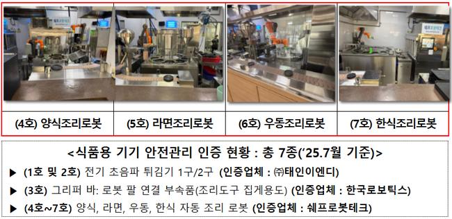 식품의약품안전처는 7월 10일, 자동으로 돈까스·라면 등을 조리하는 조리로봇 4종에 대해 ‘식품용 기기 안전관리 인증’을 완료했다고 밝혔다. 이번 인증은 자동화 식품기기의 위생 안전성을 강화하고, 국내 조리로봇 산업의 해외 진출을 지원하기 위해 추진됐다.