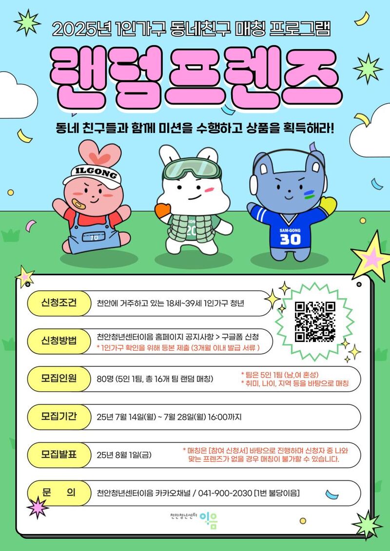 천안시, 1인 가구 청년 위한 ‘랜덤프렌즈’ 운영 - - 1인 가구 동네친구 매칭 프로그램 신청자 모집