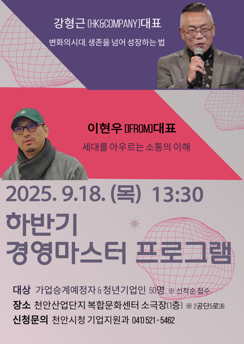천안시는 9월 18일 천안산업단지 복합문화센터에서 열리는 ‘하반기 경영마스터 프로그램’ 참여자를 모집한다고 18일 밝혔다.