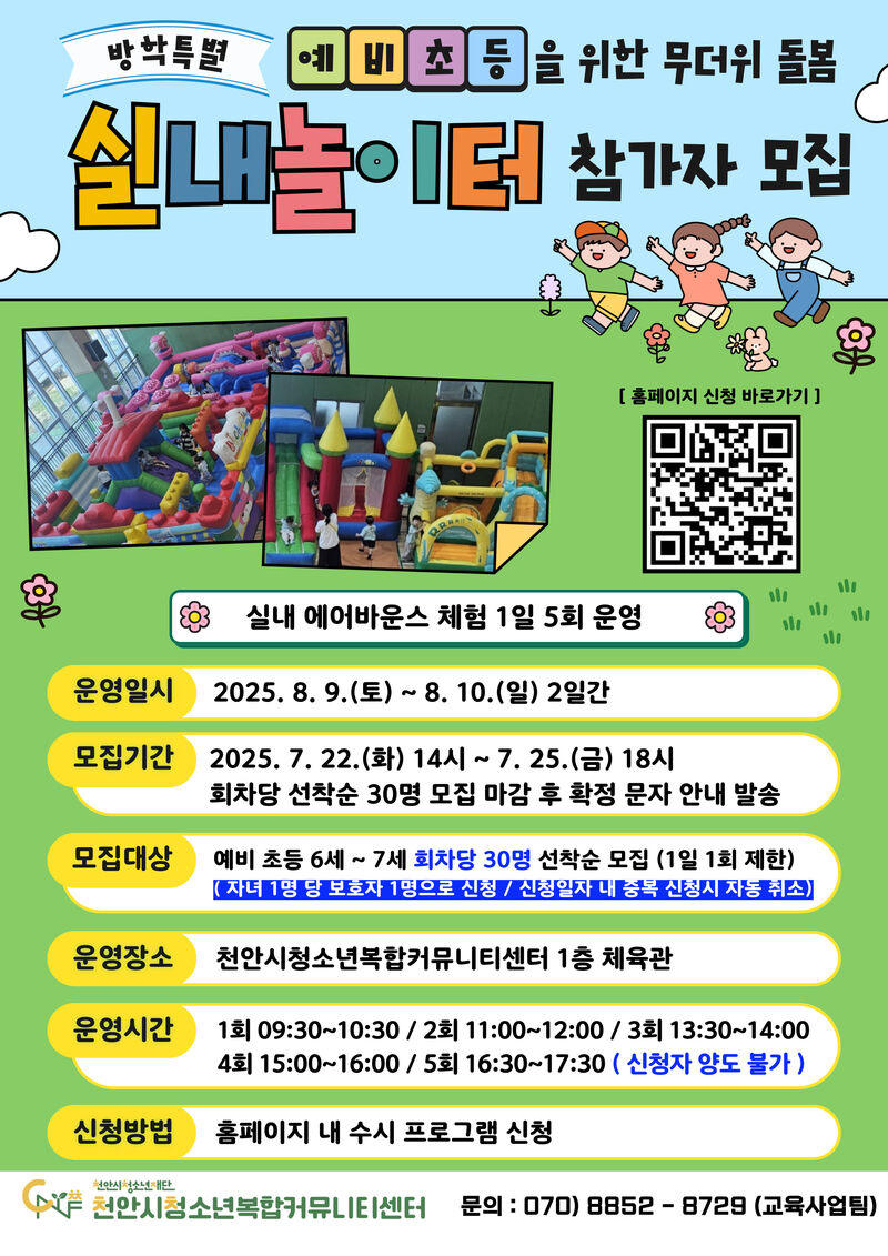 ‘안전한 여름나기 실내놀이터’ 프로그램과 관련한 자세한 사항은 천안시청소년복합커뮤니티센터 누리집(https://cayf.or.kr/ccm/)을 참고하거나, 천안시청소년복합커뮤니티센터 교육사업팀(041-557-0924)으로 문의하면 된다.