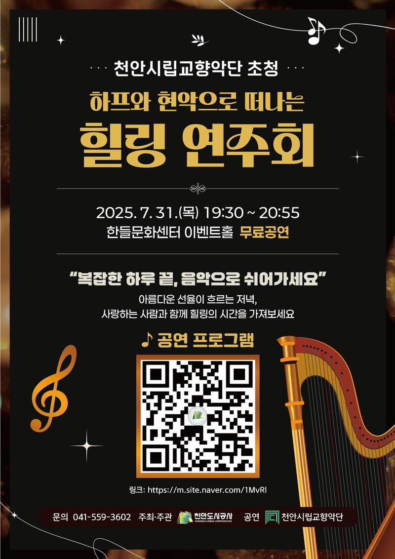올해 연주회에는 천안시립교향악단이 참여해 세계적인 작곡가들의 대표곡을 선보이며 바쁜 일상 속 시민들에게 휴식 시간을 제공한다. 하프와 현악 중심의 앙상블을 통해 정서적 안정과 따뜻한 울림을 전할 예정이다.