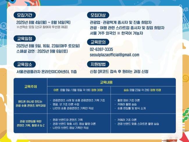 썸머스쿨은 관광 콘텐츠에 관심 있는 관광업 종사자, 예비 창업자, 한국 거주 외국인 등을 대상으로 실습 중심 교육 프로그램으로 구성됐으며, 서울관광플라자 11층 온라인미디어센터에서 매주 토요일 진행된다.