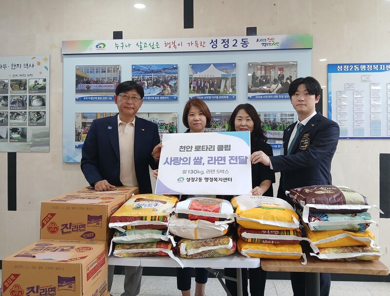천안시 성정2동(동장 나선심)은 7일 천안로타리클럽(회장 박순임)이 백미 130kg과 라면 5박스를 기탁했다고 밝혔다.