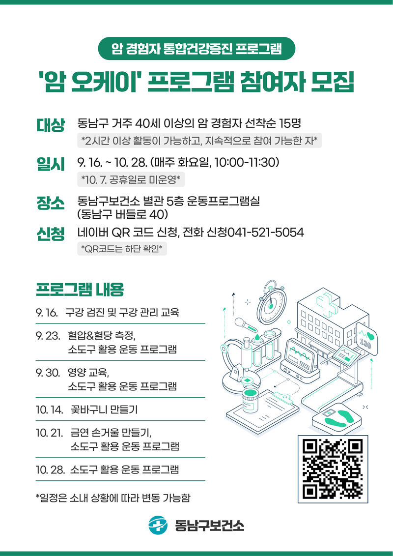 천안시 동남구보건소는 오는 9월 16일~ 10월 28일 암 경험자를 위한 통합건강증진 프로그램 ‘암 오케이’를 운영한다고 18일 밝혔다.