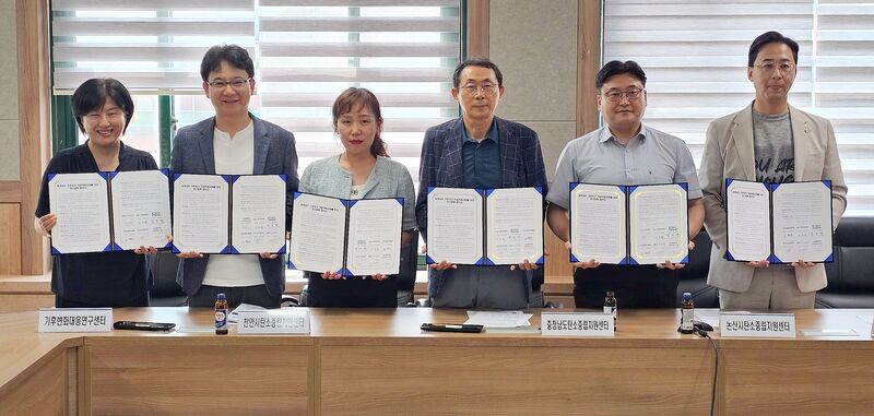 충남연구원(원장 전희경)이 19일 충청남도탄소중립지원센터(공주대학교 소재)에서 기후변화로 인한 도민 건강 피해를 최소화하고 충남형 대응 역량을 강화하기 위해 도내 5개 탄소중립지원센터와 연구 협약을 체결했다.