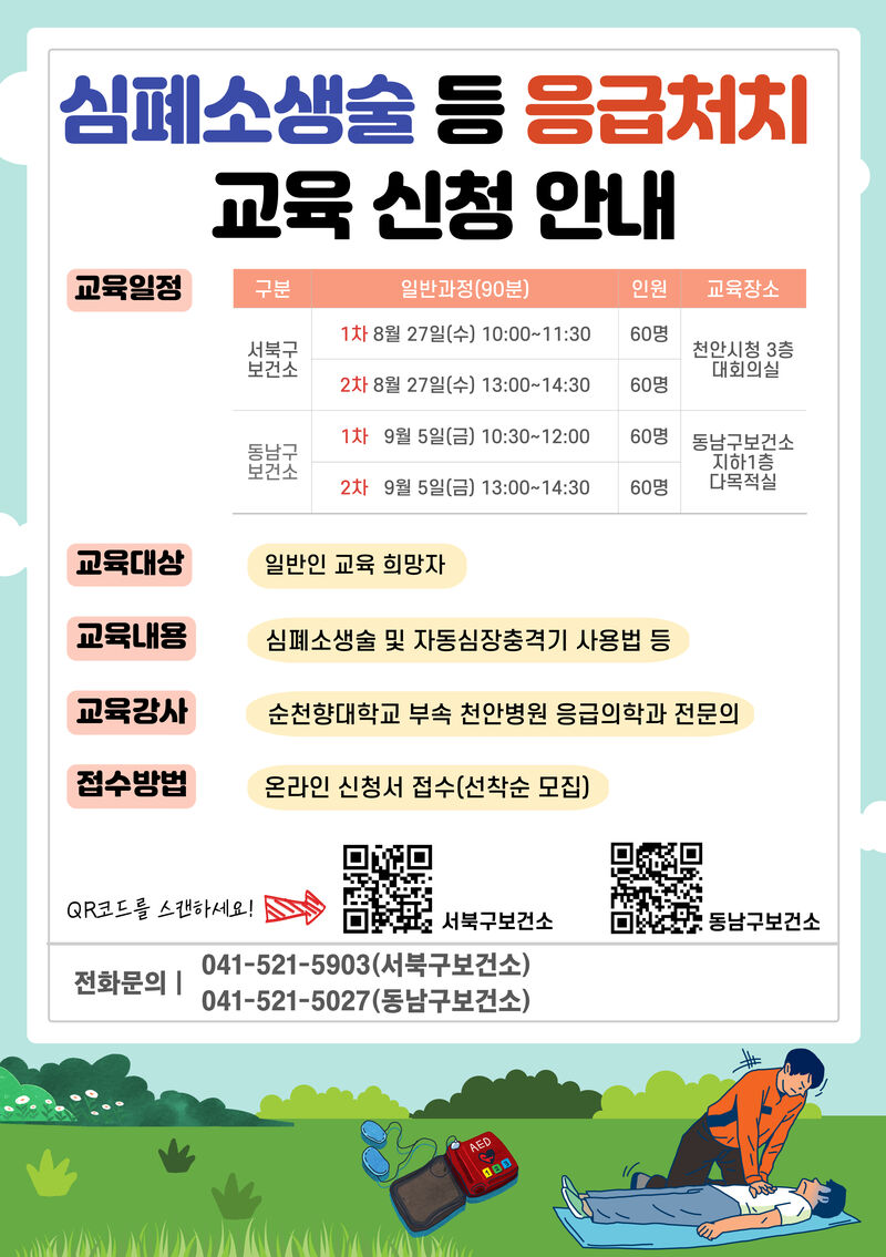 교육은 오는 8월 27일 천안시청 3층 대회의실과 9월 5일 동남구보건소 지하 1층 다목적실에서 오전 10시와 오후 1시에 진행되며, 회당 60명씩 총 240명이 참여할 수 있다.