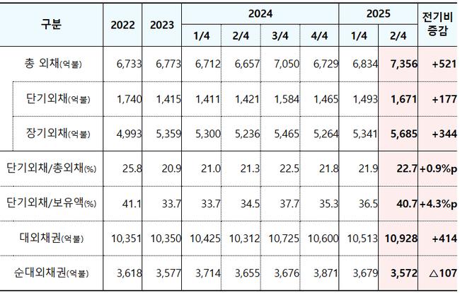 한국 2분기 대외채무 7,356억불…외국인 채권투자에 증가 - 단기외채·장기외채 모두 확대…정부·은행 중심으로 증가 - 대외채권도 늘었지만 순대외채권은 소폭 감소 - 단기외채 비중 상승했으나 외채 건전성은 안정적 수준 유지