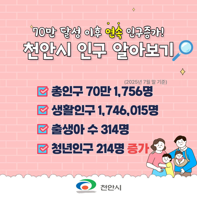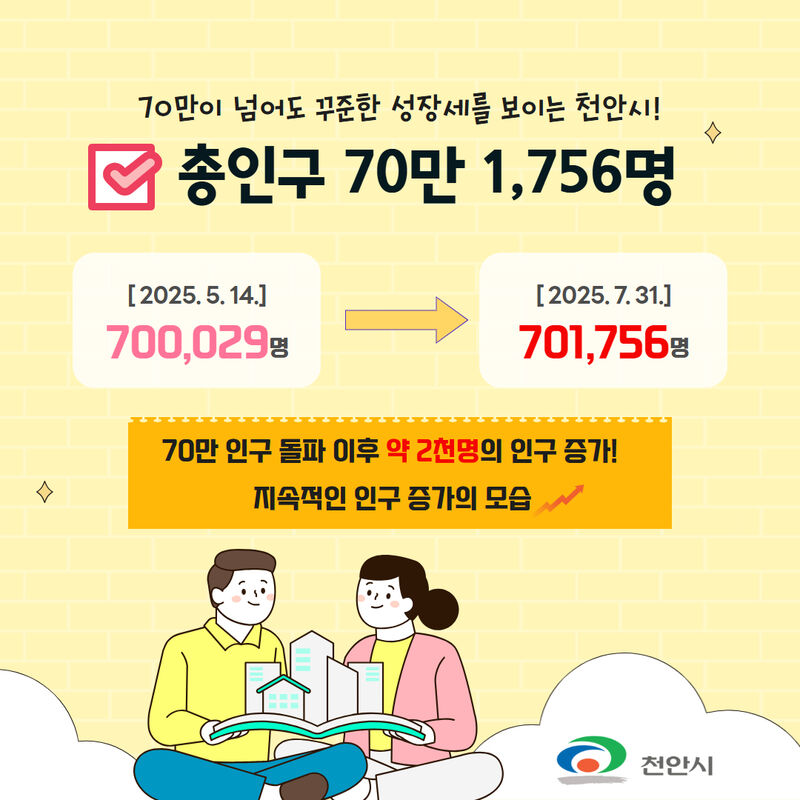7월 말 기준 천안시의 총인구는 70만 1,756명이다. 이는 총인구 70만 명을 넘어선 지난 5월 14일 당시의 인구(70만 29명)보다 1,727명이 증가한 것으로 안정적인 인구 성장세를 보이고 있다.