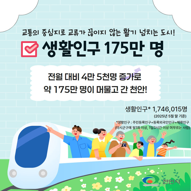 생활인구와 청년인구도 늘고 있다. 5월 말 기준 천안시의 생활인구는 174만 6,015명으로 집계됐다. 이는 전월 170만 44명 대비 2.7%(4만 5,971명) 늘어난 수치다.