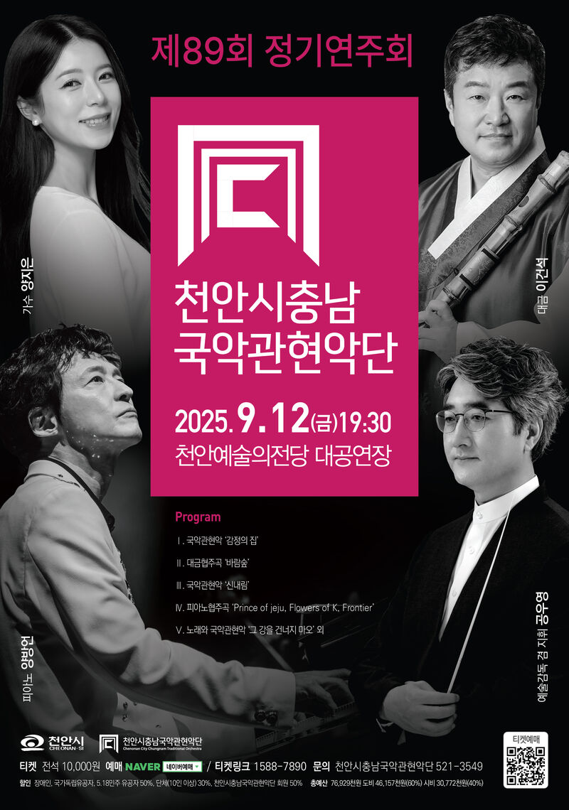 티켓은 티켓링크와 네이버를 통해 예매할 수 있으며, 문의사항은 시 문화예술과(041-521-3416), 천안시충남국악관현악단(041-521-3549)으로 하면 된다.