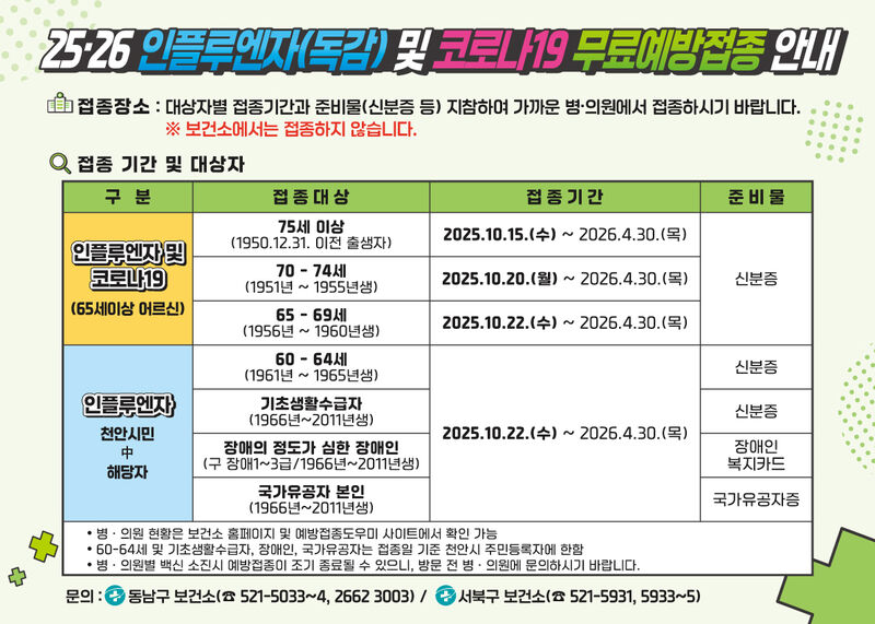 접종은 천안시 관내 242개 위탁 의료기관(어린이 대상 기관 121개소)에서 가능하며, 병·의원 현황은 예방접종 도우미 누리집 ‘의료기관 찾기’ 또는 서북구·동남구보건소 누리집에서 확인할 수 있다.