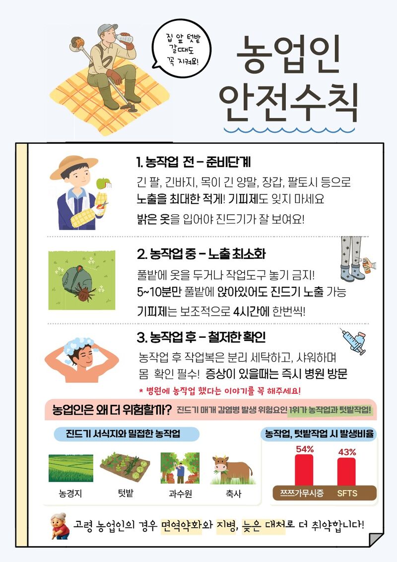 서동철 농촌자원과장은 “예방수칙만 철저히 지켜도 충분히 막을 수 있는 질환”이라며 “농작업 시 반드시 예방수칙을 준수하고, 집 앞 텃밭처럼 가까운 장소에서도 방심하지 않는 것이 무엇보다 중요하다”고 강조했다.