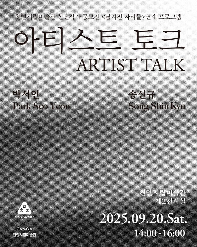 아티스트 토크는 선착순 성인 30명을 대상으로 진행되며, 신청은 오는 19일 오후 5시까지 천안시립미술관 누리집에서 하면 된다. 당일 잔여석에 한해 현장접수도 가능하며, 자세한 사항은 시각예술팀(041-900-1863)으로 문의하면 된다.