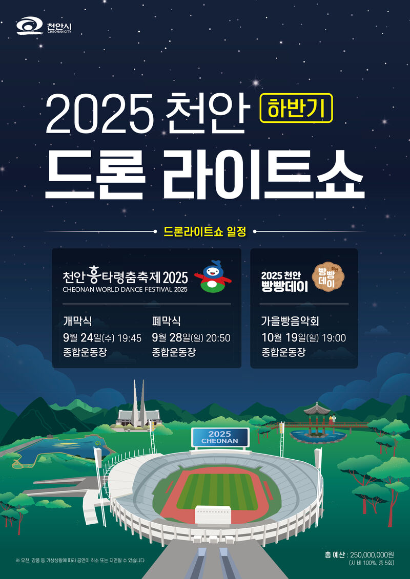 시는 오는 24일 천안종합운동장 일원에서 열리는 천안흥타령춤축제 2025 개막식을 시작으로 28일 폐막식에서 각 회차당 1,000여 대의 드론 군집비행을 선보인다.