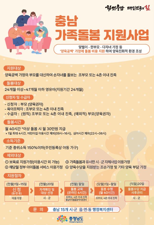 충남도가 영유아 가족 돌봄을 사회적 가치가 있는 노동으로 인정하고 가족구성원의 삶의 질을 높이며, 양육 친화적인 환경을 조성하기 위한 제도를 본격적으로 시행한다.