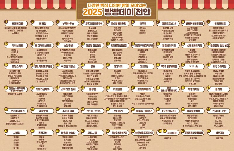 시 관계자는 “‘빵빵데이 천안 2025’은 빵의 도시 천안을 대표하는 빵 축제인 만큼 다양한 체험행사와 이벤트, 동네빵집의 개성이 담긴 빵, 쌀을 원재료로 한 빵을 준비했다”고 말했다.