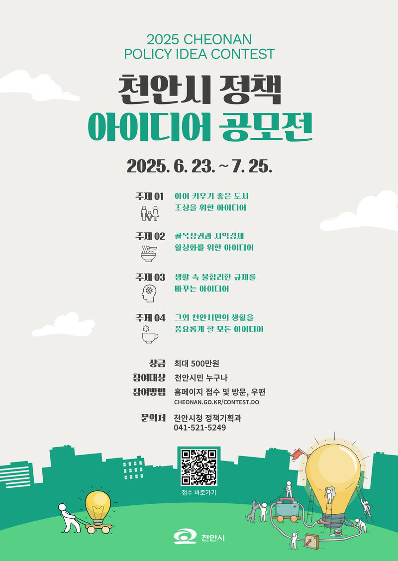 천안시는 시민이 직접 참여해 참신한 아이디어로 시정 변화를 만들어가는 ‘2025 하반기 천안시 정책 아이디어 공모전’을 개최한다고 21일 밝혔다.