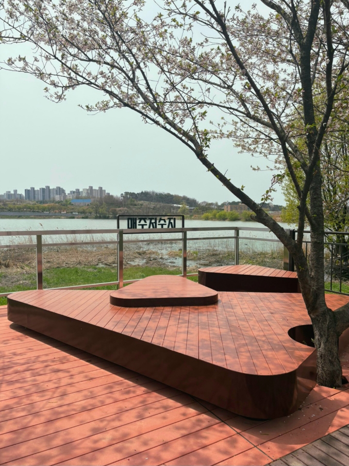 단차 구조로 앉거나 눕는 등 다양한 자세로 이용할 수 있으며, 반원형 홈을 통해 수목이 관통하도록 설계되어 자연과의 조화를 이루고 그늘을 활용한 차양 효과를 갖추었다.