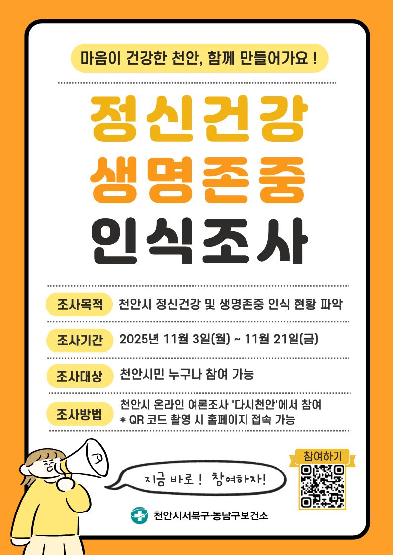 천안시는 이번 조사를 통해 시민들의 정신건강에 대한 관심을 높이고, 생명존중 문화가 확산될 수 있는 마음이 건강한 지역사회 환경을 조성할 계획이다.