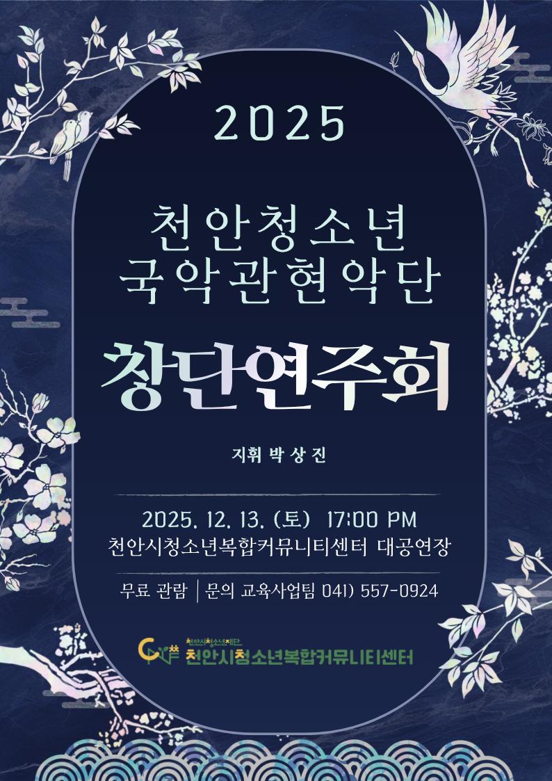 천안청소년국악관현악단은 2025년 8월 30일 창단해 청소년들의 전통문화 예술 역량 강화와 문화 감수성 함양, 건전한 여가문화 형성을 목표로 운영되고 있다.