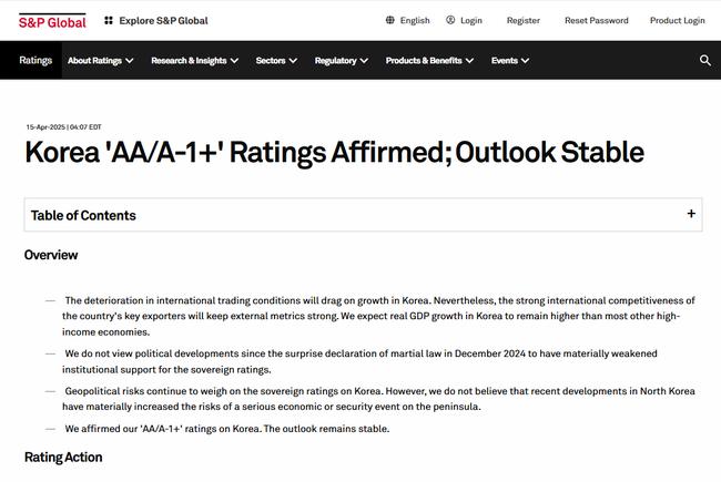 국제 신용평가사 스탠더드앤드푸어스(S&P)는 한국의 국가신용등급과 전망을 ‘AA, 안정적’으로 유지한다고 발표하며, 최근 정치적 불확실성에도 불구하고 한국의 제도적 안정성과 재정 건전성, 대외 수지 등을 긍정적으로 평가했다고 15일 밝혔다.