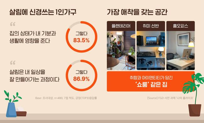 또한 이들에게 집은 단순한 거주지가 아닌 ‘자기보존’과 ‘취향적층’의 공간이었다. 83.5%는 “집 상태가 내 기분과 생활에 영향을 준다”고 답했고, 86.9%는 “살림은 일상을 잘 만들어가는 과정”이라고 응답해 집안 환경과 살림에 높은 관심을 보였다.