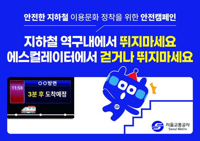 마해근 서울교통공사 영업본부장은 “지하철 내 계단이나 에스컬레이터에서의 뛰는 행위는 자칫 대형 사고로 이어질 수 있는 만큼, 절대로 뛰지 말고 안전 수칙을 준수해 줄 것을 당부드린다”며 “시민과 공사가 함께 안전하고 편리한 지하철 환경 조성을 위해 노력하겠다”고 밝혔다.