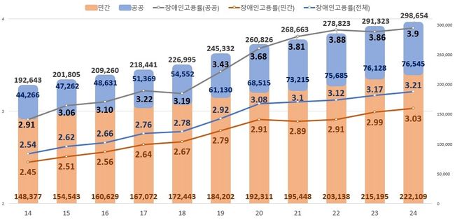 고용노동부가 28일 발표한 2024년 장애인 의무고용현황에 따르면, 전체 장애인 고용률은 3.21%로 전년 대비 0.04%p 상승했다. 장애인 고용인원은 총 298,654명으로 전년보다 7,331명 증가했다.
