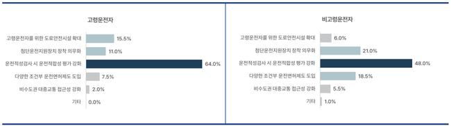 조사에 따르면 고령운전자의 64.0%, 비고령운전자의 48.0%가 ‘운전적성검사 시 운전 능력 평가 강화’가 고령운전자 교통사고 예방을 위한 최우선 과제라고 답했다. 이어 고령운전자는 도로안전시설 확대(15.5%)와 첨단운전지원장치 장착 의무화(11.0%)를, 비고령운전자는 장치 장착 의무화(21.0%)와 조건부 운전면허제 도입(18.5%)을 주요 대책으로 꼽았다.