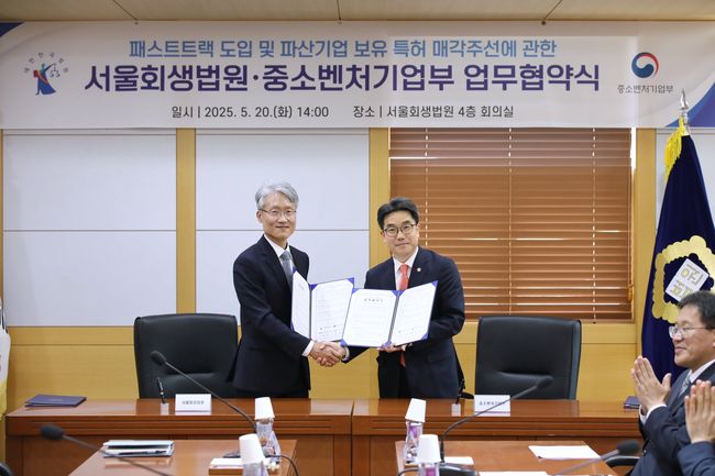 중소벤처기업부(장관 오영주)가 서울회생법원과 파산기업 기술거래 정례화 및 소상공인 파산·회생 패스트트랙 신설을 위한 업무협약(MOU)을 5월 20일 체결했다고 발표했다.