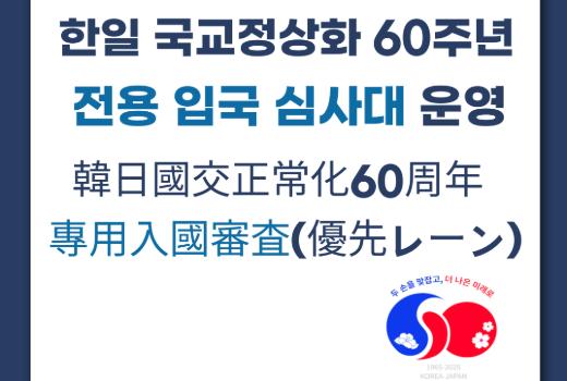 한일 양국 정부는 2025년 한일 국교정상화 60주년을 기념하는 다양한 사업의 일환으로 전용 입국심사대 운영을 추진한다. 앞서 양국은 60주년 기념 로고 슬로건 선정(‘24년 12월), 남산 서울타워와 도쿄타워 동시 점등(‘25년 2월) 등의 기념행사를 진행했으며, 한일 양국 대사관 주최 기념 리셉션 등 다양한 공동행사를 추진하고 있다.