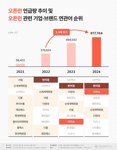 ‘오픈런’ 관련 기업·브랜드 연관어 순위를 보면 지난 2021년 백화점·명품 브랜드가 대부분이었던 것과 달리 2022년 편의점, 2023년 다이소가 상위권에 들어섰다. 과거 명품 구매를 위해 백화점에 오픈런하던 것에서 편의점·다이소의 저가 상품으로 오픈런 대상이 변화한 것이다.